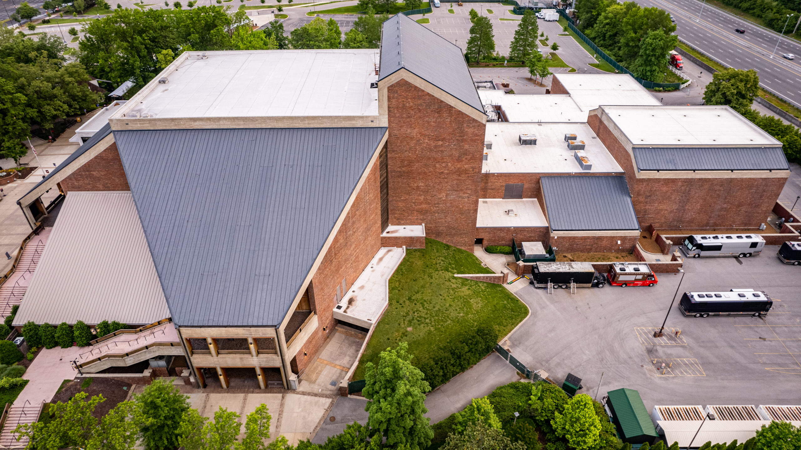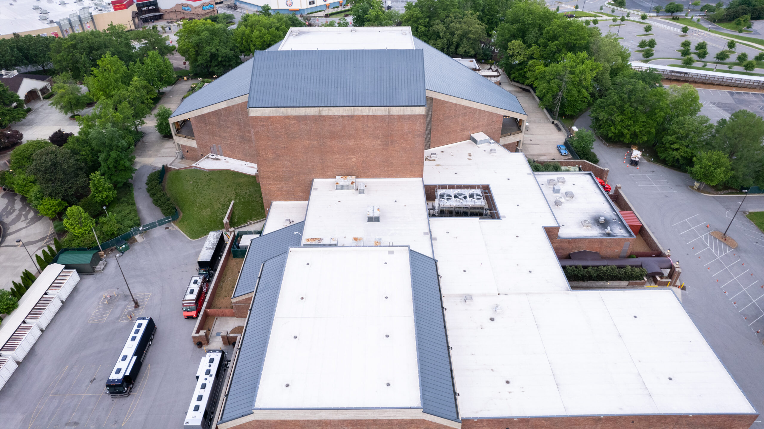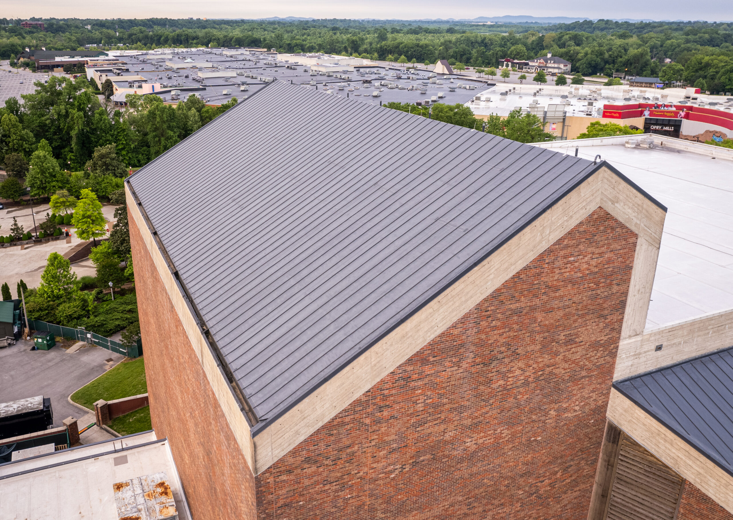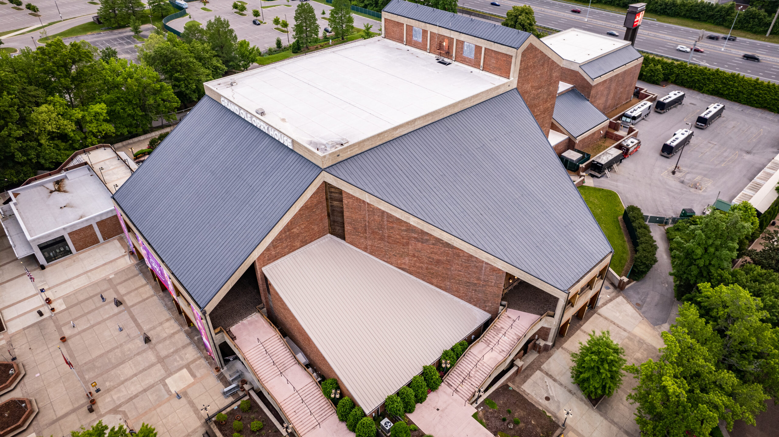 They replaced the existing concrete tile roof system with a new modified bitumen vapor barrier, a 60 mil Fibertite membrane, and CR-20 foam adhesive. The Grand Ole Opry’s 105,000 square feet of the roof were covered by a ribbed metal roofing system, including the main theater (45,000 square feet) and the 60,000 square feet of TPO flat roof sections.