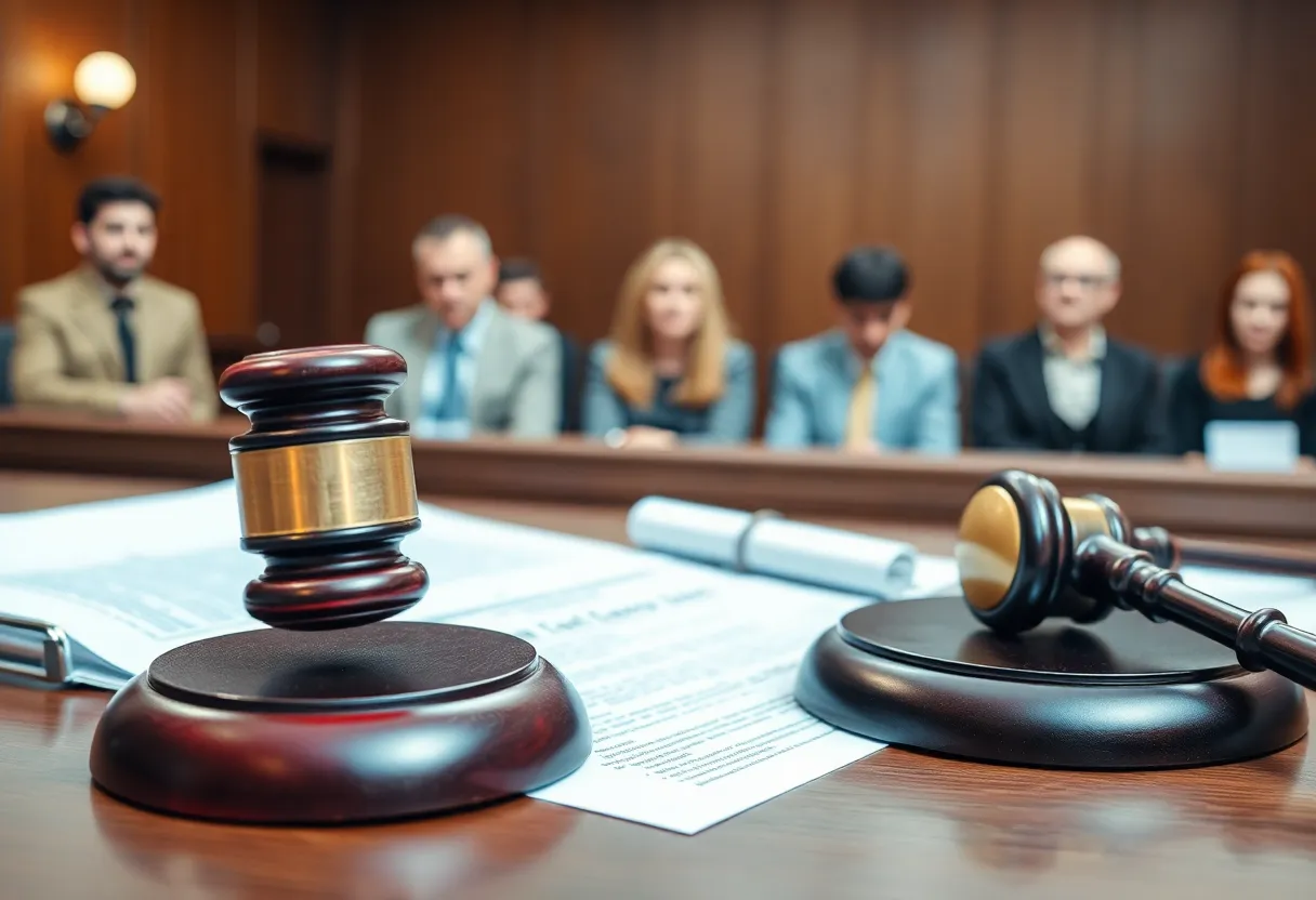 Courtroom scene representing workplace harassment case